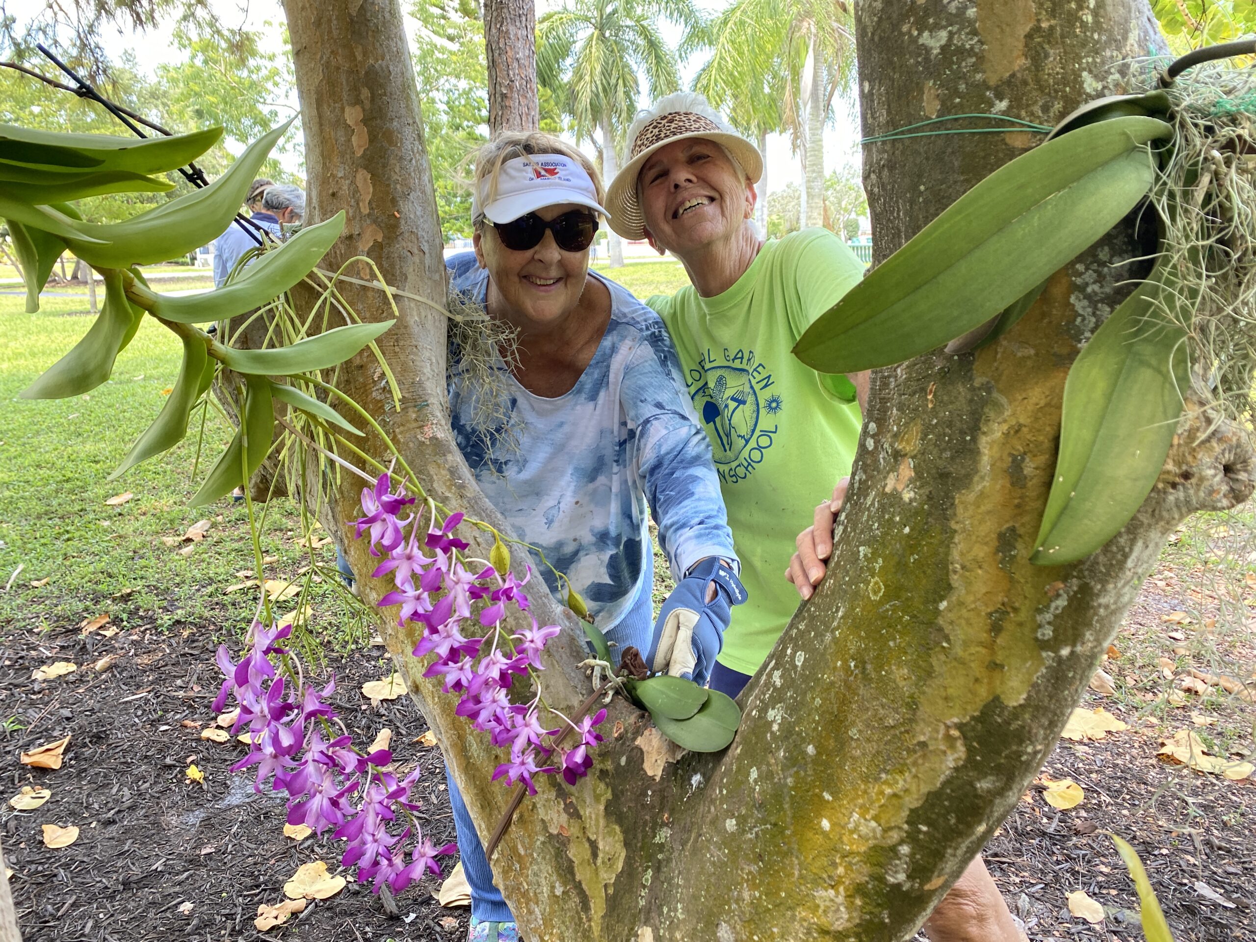 In addition to collecting plants donated by garden club current members, Foley and Oldershaw contacted the family of the late Eva Schliesser, a founder of Calusa Garden Club, and asked permission to transfer some of Schliesser’s tree-mounted orchids to the new garden. The results are spectacular! Two extremely large orchids made the transfer and are mounted in the seagrape trees in the garden. Foley and Oldershaw plan to populate the garden with as many plants from Calusa Garden Club founders’ gardens as possible. The photo shows Foley and Oldershaw fastening a large orchid from Schliesser’s collection to one of the seagrape trees.